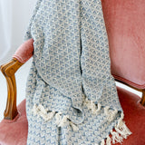 The ultimate in sustainable comfort, this cotton throw is made from recycled cotton, which is separated and spun into new threads. The threads are dyed a beautiful bluish/gray and re-woven into this cozy throw and is finished with knotted fringe ends.