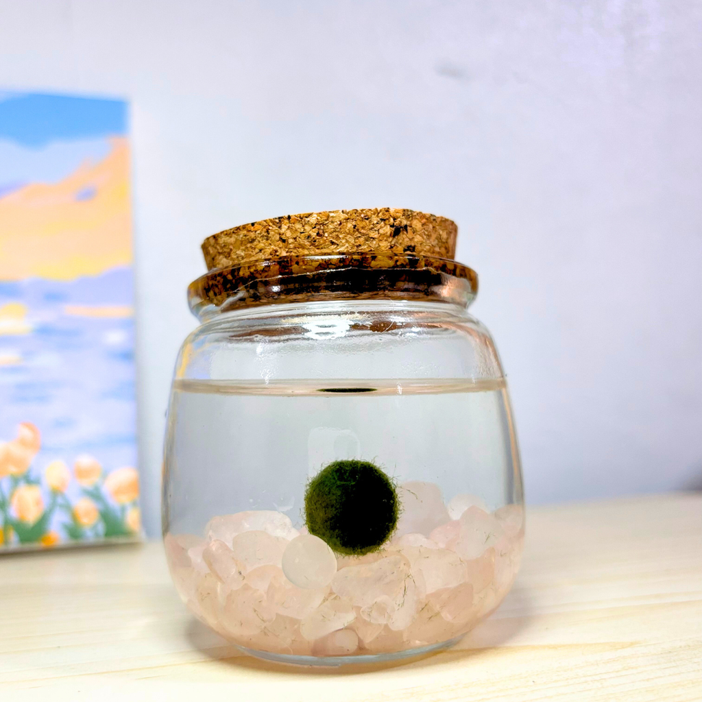 Medium Marimo Moss Ball Terrarium with Rose Quartz Gemstones