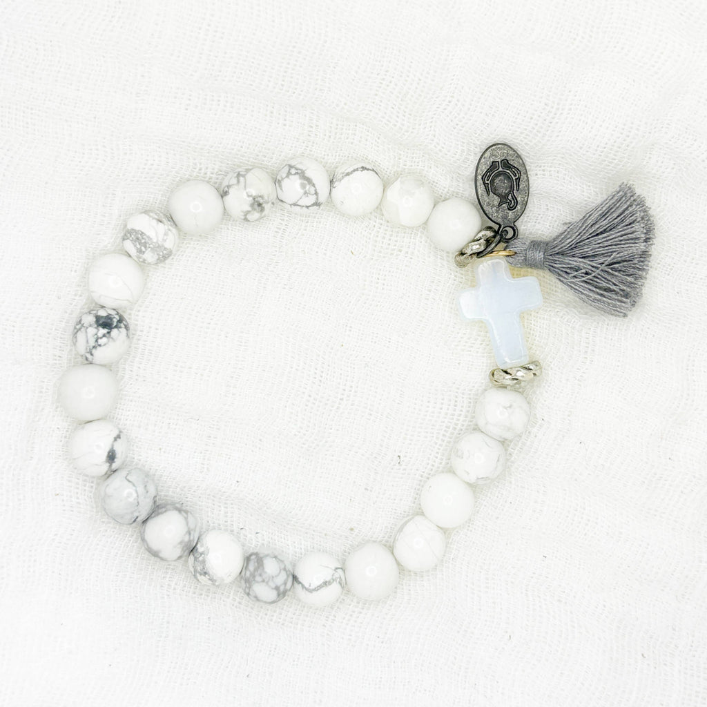 Handmade by survivor-artisans, the beaded Grace Bracelet features white and grey marbled turquoise beads, agate cross and grey tassel.