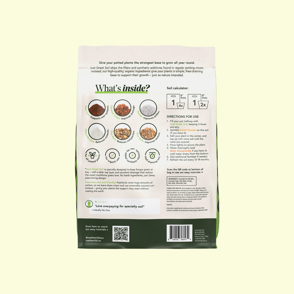 Peat-free, organic, nutrient-rich potting mix that’s resistant to fungus gnats and ideal for all indoor and outdoor plants. Give your plants the strong, healthy start they deserve with Just Great Soil, an organic, nutrient-rich potting mix made for all indoor and outdoor potted plants. This peat-free, pesticide-free blend feeds roots, fuels vibrant growth, and keeps leaves lush without any gimmicks or harsh additives. Thoughtfully designed to resist common pests like fungus gnats, it helps plants stay healthy even in tricky indoor conditions.