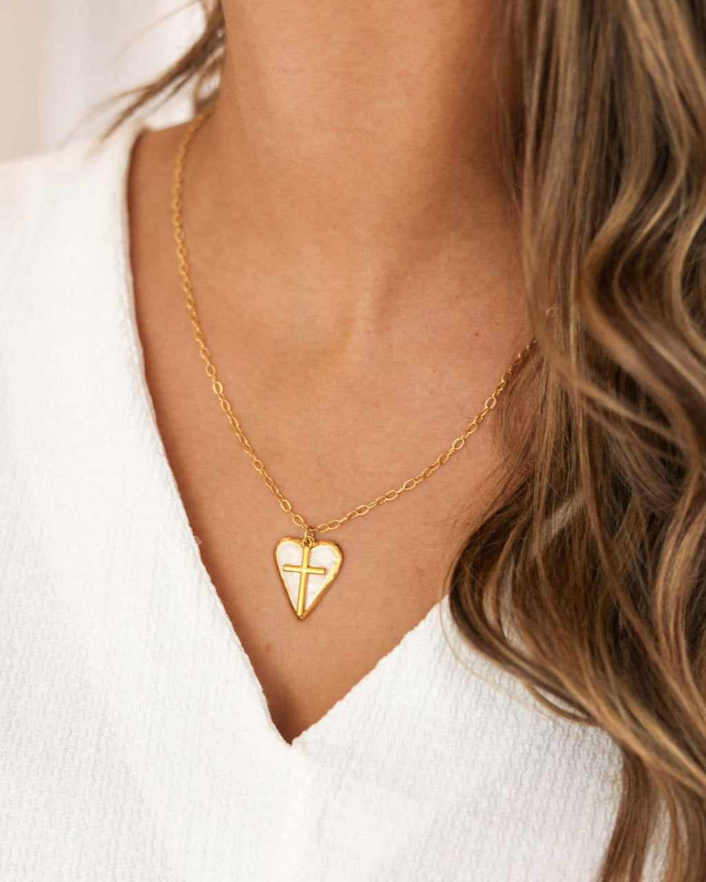Crafted with exquisite detail, the Demi Necklace features a 24k gold plated heart and cross pendant on a 24" decorative chain. The pearl white enameled heart adds a touch of elegance to this must-have accessory.