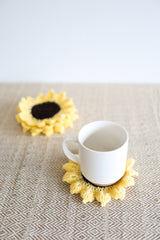 This cute set of four sunflower coasters is sure to brighten up any space in your home! These are a soft yellow acrylic yarn with brown center, tied together with a ribbon. Handmade in the Dominican Republic, employing a girl aging out of a children's home.